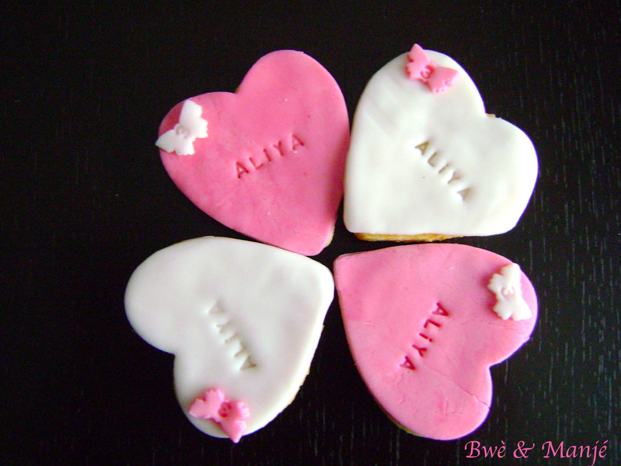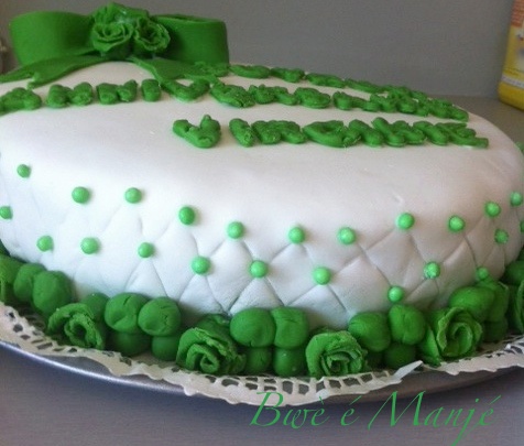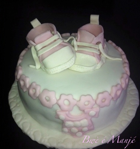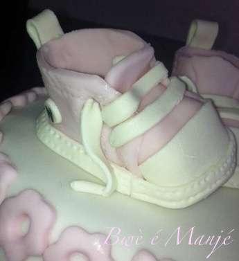 chaussur pâte à sucre (rose), pâte d’amande (blanc)